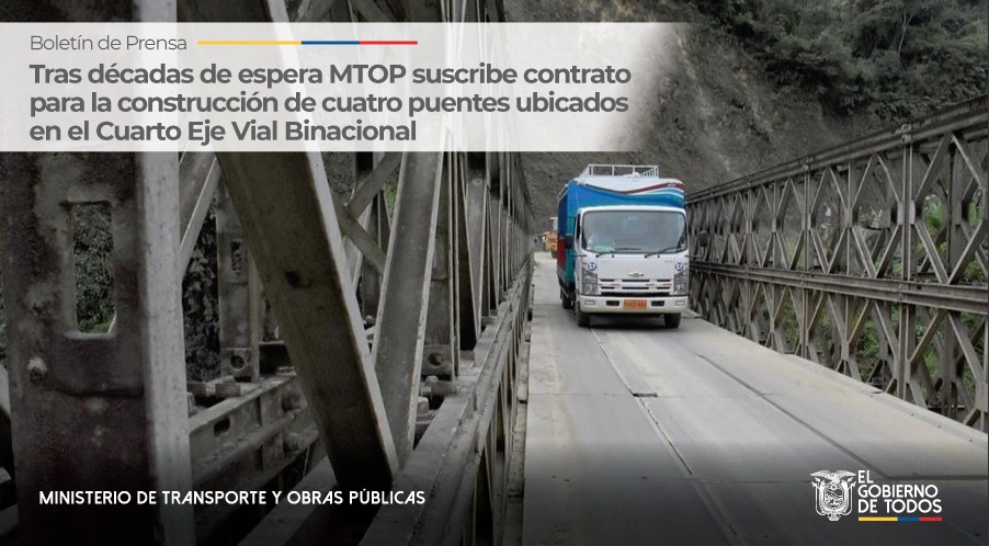 El Gobierno Nacional a través del Ministerio de Transporte y Obras Públicas (MTOP) cumple los compromisos viales con la provincia de Zamora Chinchipe, mediante la suscripción del contrato para la “construcción de los puentes: Quebrada Honda, Palanda, Agua Dulce y Palanumá”, ubicados en el tramo I (Vilcabamba – Yangana – Valladolid – Palanda – Bellavista) del Cuarto Eje Vial, con una inversión de aproximadamente USD 7 millones.