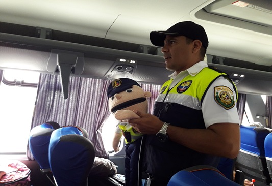 “Debemos generar una cultura de Seguridad Vial que nos involucre a todos los ciudadanos en la prevención de los siniestros de tránsito”, dijo “Vialito”, un títere utilizado en esta campaña por la Comisión de Tránsito del Ecuador (CTE), manipulado por el oficial, Carlos Rivas.